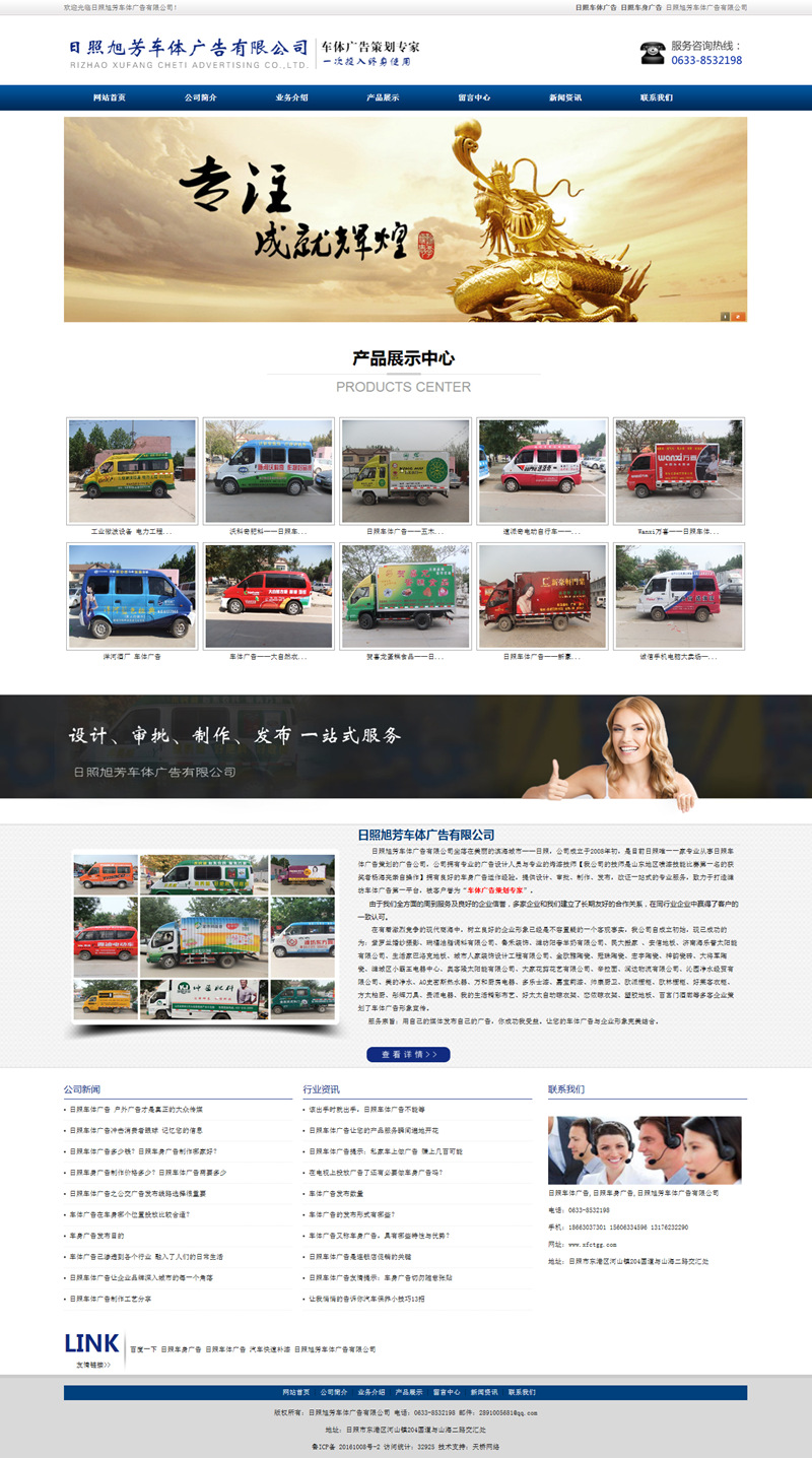 日照旭芳車體廣告有限公司坐落在美麗的濱海城市——日照,公司成立于2008年初,是目前日照唯一一家專業(yè)從事日照車體廣告策劃的廣告公司,公司擁有專業(yè)的廣告設(shè)計人員與專業(yè)的烤漆技師【我公司的技師是山東地區(qū)噴漆技能比賽第一名的獲獎?wù)邨詈A劣H自操作】擁有良好的車身廣告運作經(jīng)驗,提供設(shè)計、審批、制作、發(fā)布,改證一站式的專業(yè)服務(wù),致力于打造濰坊車體廣告第一平臺,被客戶譽為“車體廣告策劃專家”。